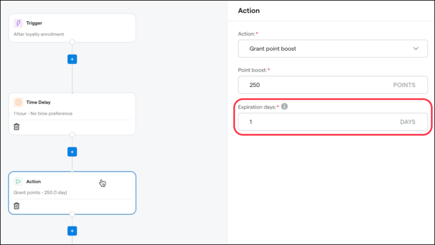 Custom point expiration allows you to specify a number of days until points granted via a point boost will expire. When creating a point boost in Workflows, an Expiration days field will now appear. Points customers earn from satisfying the workflow will expire after that many days, regardless of whether or when your loyalty points normally expire. If your loyalty points never expire, this field is optional.