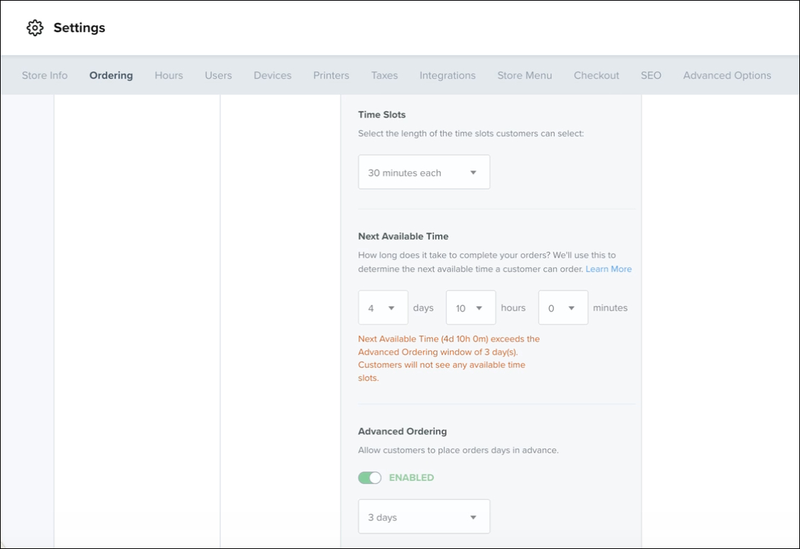 New warning messages alert you when the configuration could result in no available time slots for customers (e.g., when Next Available Time exceeds the Advanced Ordering window).