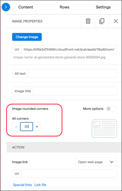 When creating campaigns, the Image Properties section now allows you to round image corners by entering a number of degrees.