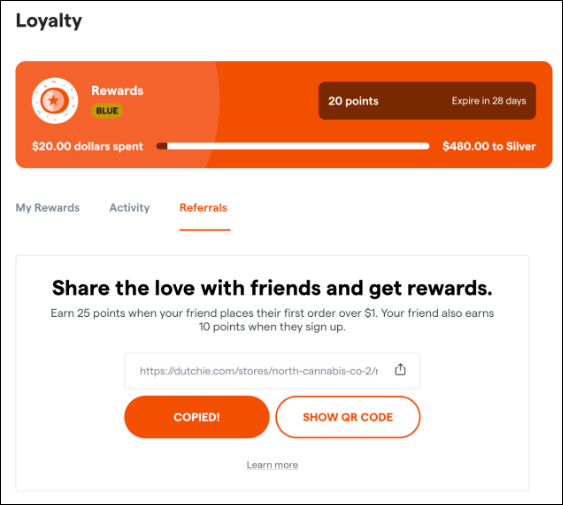 Existing members of your Dutchie loyalty program can now share a loyalty signup link or QR code with a friend.