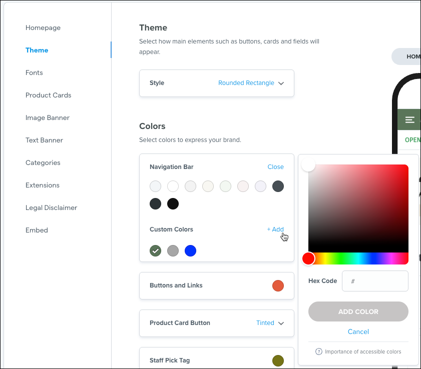 In Customize > Theme, you can now set custom colors for your navigation bar by using the color picker or entering a hex code.