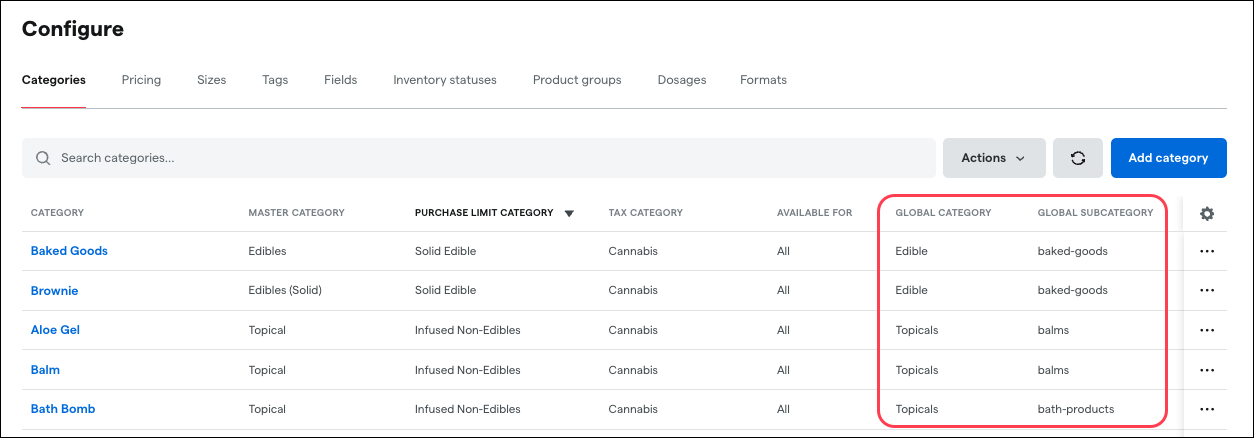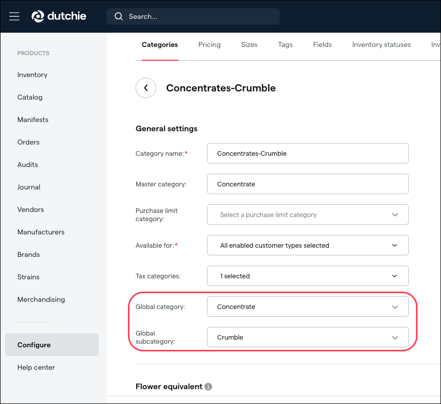 In Products > Configure > Categories, use the new Global category and Global subcategory fields to map all products in that category to the selected category and subcategories in Dutchie E-Commerce.