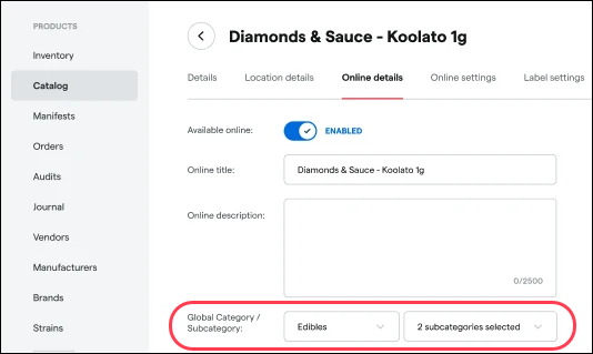 You can select a different Global category and Global subcategory for a specific product on the product's Online details tab. This product-level selection will override category-level selection. At both the category and product level, you can assign more than one global subcategory.